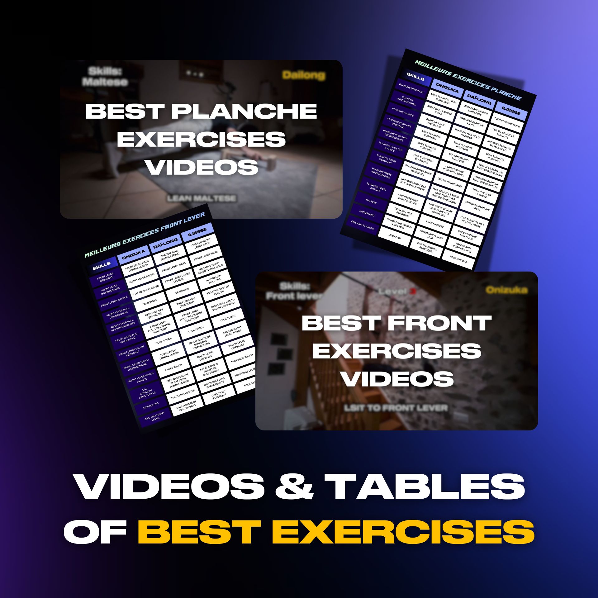 Des tableaux et vidéos regroupant LE meilleur exercice selon chacun d’entre nous pour chaque skill et chaque niveau.