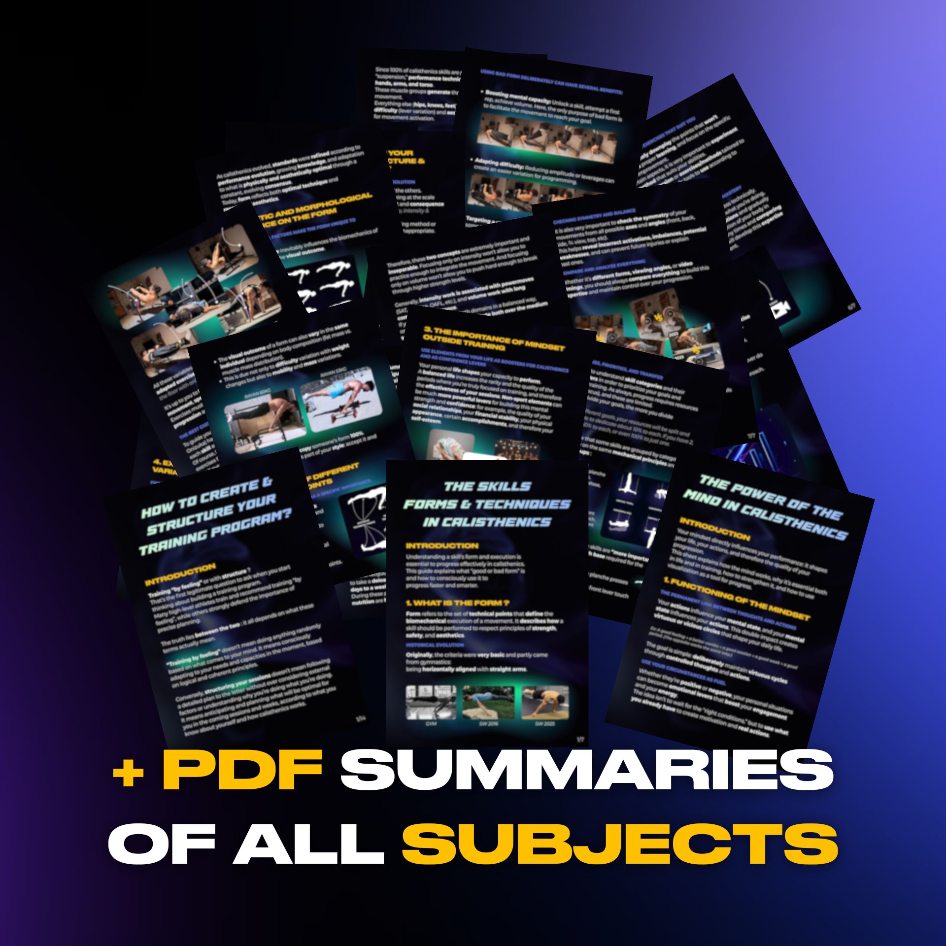 3 heures de vidéos brutes ainsi que des synthèses PDF sur les sujets les plus importants en calisthenics.
