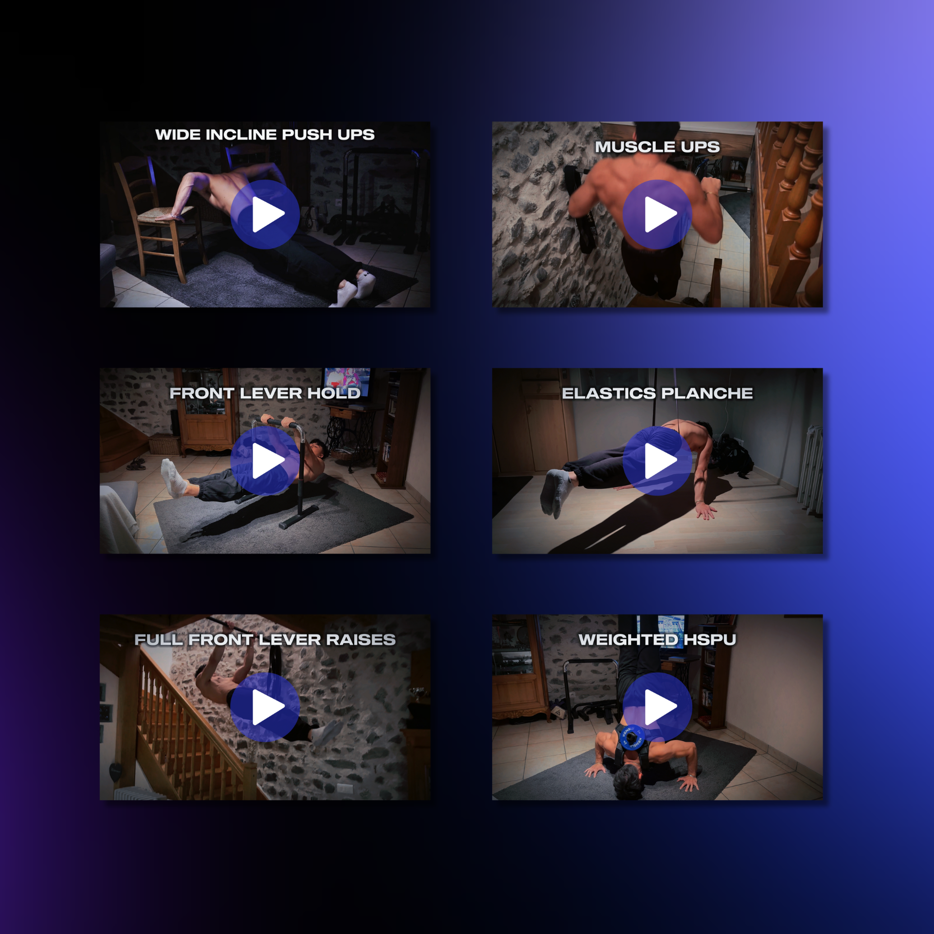 As a bonus, you'll explore advanced skills like 90° handstand push-ups, muscle-ups, the planche and the front lever, enabling you to progress endlessly.