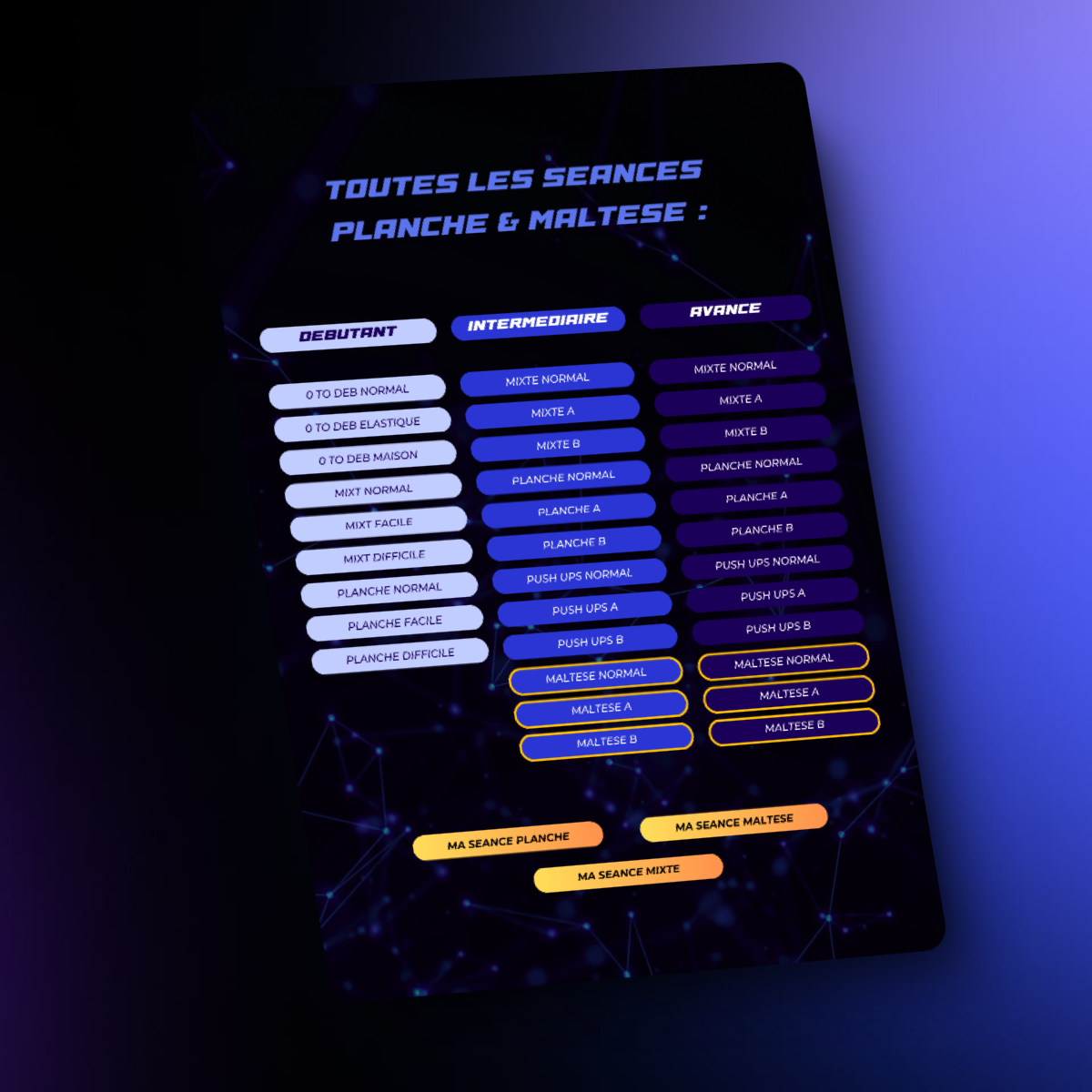 Pour les débutants tu auras 2 types de séances : des séances ciblées sur la planche, et des séances mixants planche et un peu le travail de la maltese. Chaque type de séance est divisé en 3 niveaux de difficulté (une normale, une facile et une difficile).
